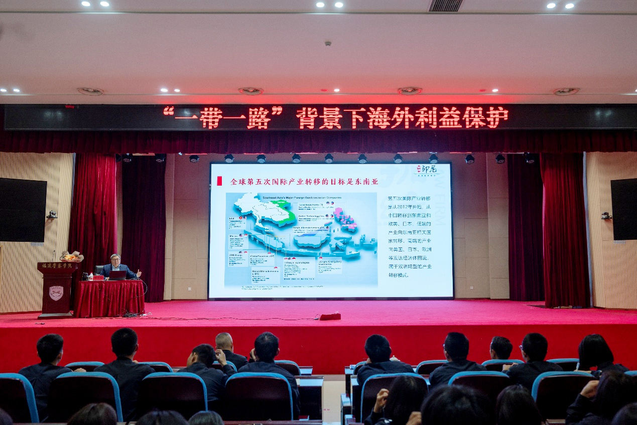 讲座中,许永东结合自身丰富的涉外法律服务实践,深入解读了国际产业转移趋势,系统分析了海外重点区域的投资环境、优势产业及潜在的法律合规风险,重点介绍了其团队所构建的“法律+商务+安保”一站式综合服务模式在维护海外利益中的成功经验。