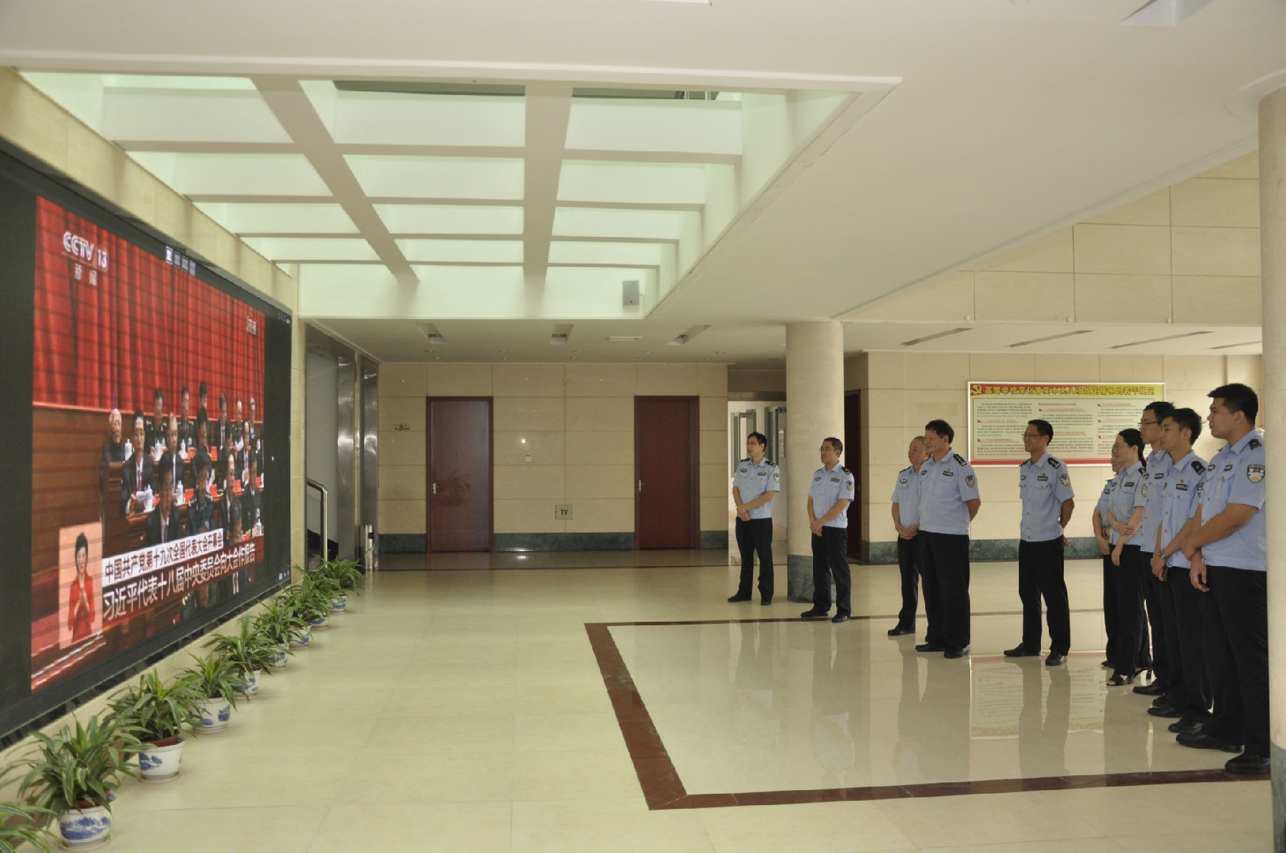 院领导、各部门负责人在行政楼三楼会议室集体收看了开幕式实况直播。办公室、组织部、宣传部、学工处、国资处、成教处等部门教职工在行政楼一楼收看点观看直播。各党总支、党支部还组织师生通过电视、电脑、手机等媒体观看直播。收看过程中,师生身着警服、佩戴党徽,以昂扬的精神状态认真听取报告,仿佛置身于大会现场,不时激动,不时自豪,不时骄傲,表现出了对党的无限热爱和对十九大的热切期待。观看结束后,师生撰写心得体会,开展学习讨论活动,纷纷表示要以党的十九大精神为指引,坚定理想信念,不忘初心,牢记使命,为实现中华民族伟大复兴的中国梦而不懈奋斗。