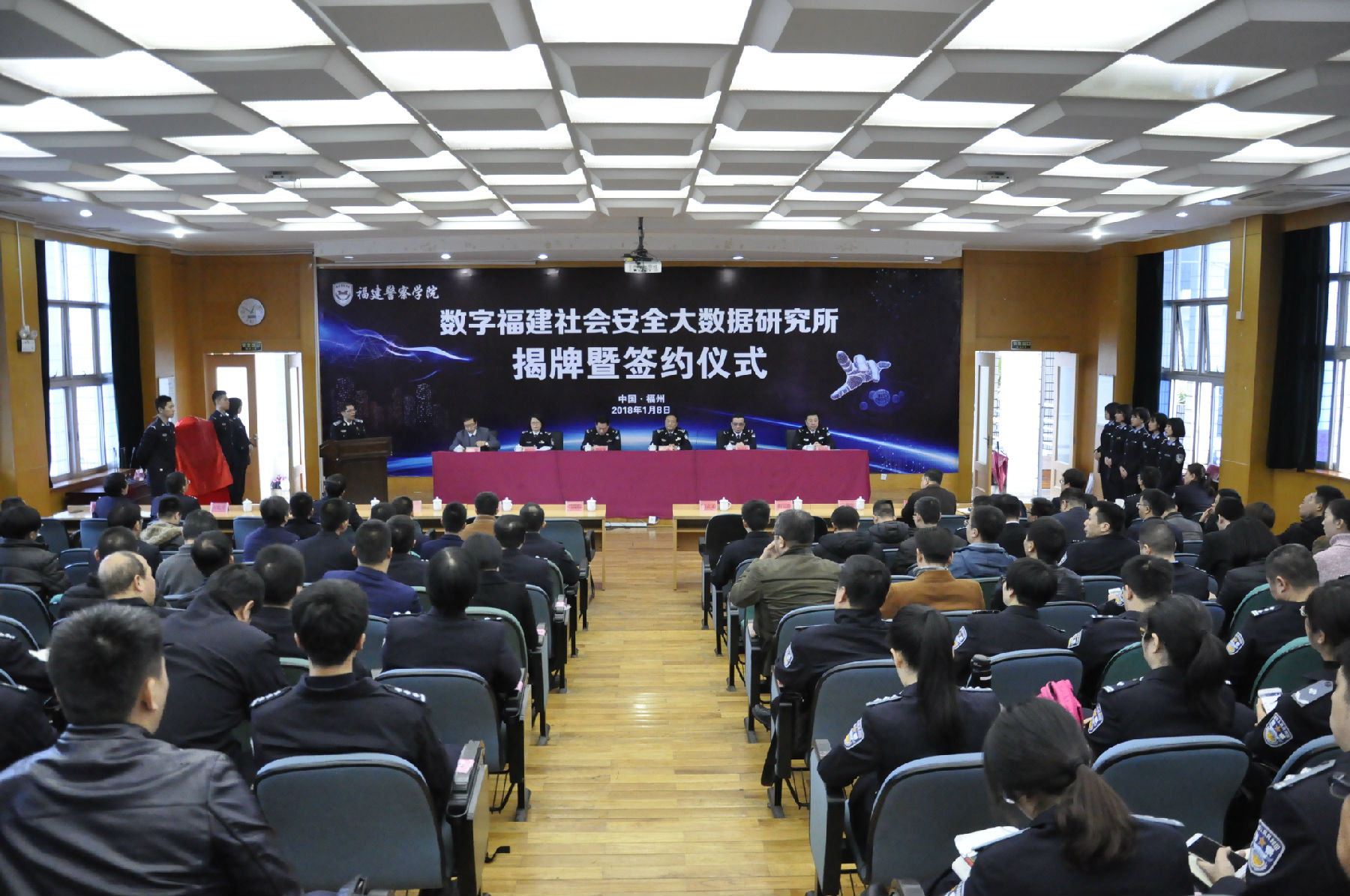 1月8日,我院举办数字福建社会安全大数据研究所揭牌暨签约仪式,省公安厅110大数据情报指挥中心、刑事技术总队、交通警察总队、网络安全总队、科技通信处、经济侦查总队、禁毒总队、晋江市公安局和厦门市美亚柏科信息股份有限公司等27个单位的58位代表,学院院长刘瑞榕、副院长胡宝珍及相关教师出席了仪式。